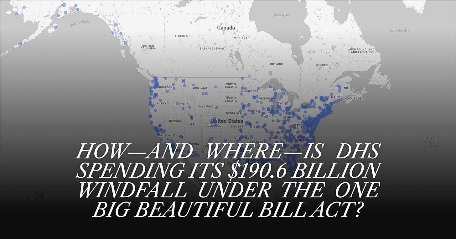 Project Salt Box is releasing a DHS Contract Visualizer to make that data easier to examine. The tool aggregates federal procurement records and allows users to see how OBBBA funding is being obligated as contracts are awarded and modified. For best results, the visualizer is best viewed on a large screen or on a mobile device in landscape orientation.