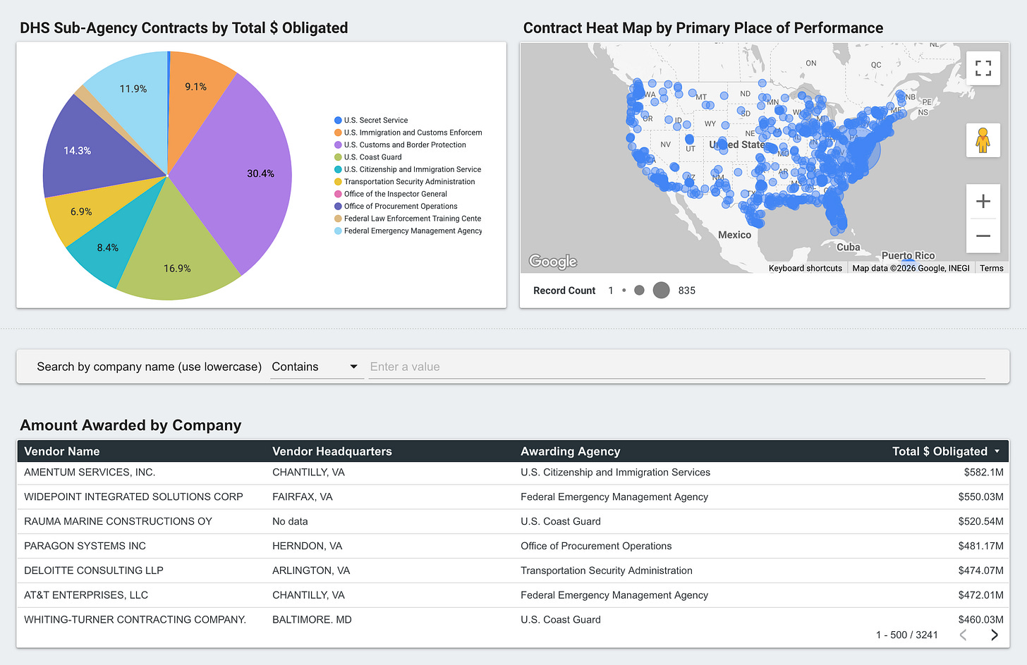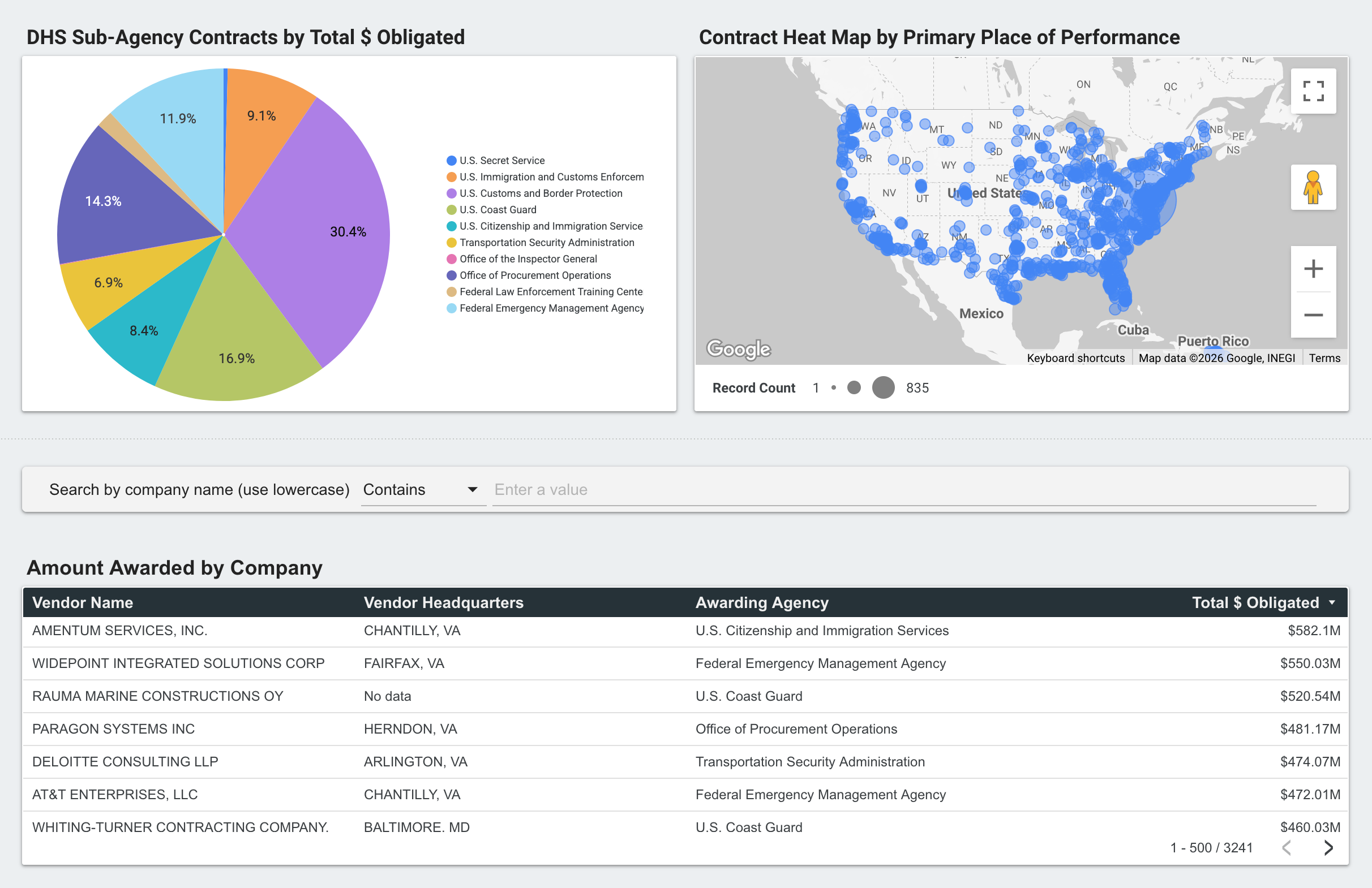 Connected Views: Click any data point—such as a contractor, agency, or state—to automatically filter the entire report and reveal how individual awards connect to broader spending patterns across DHS.